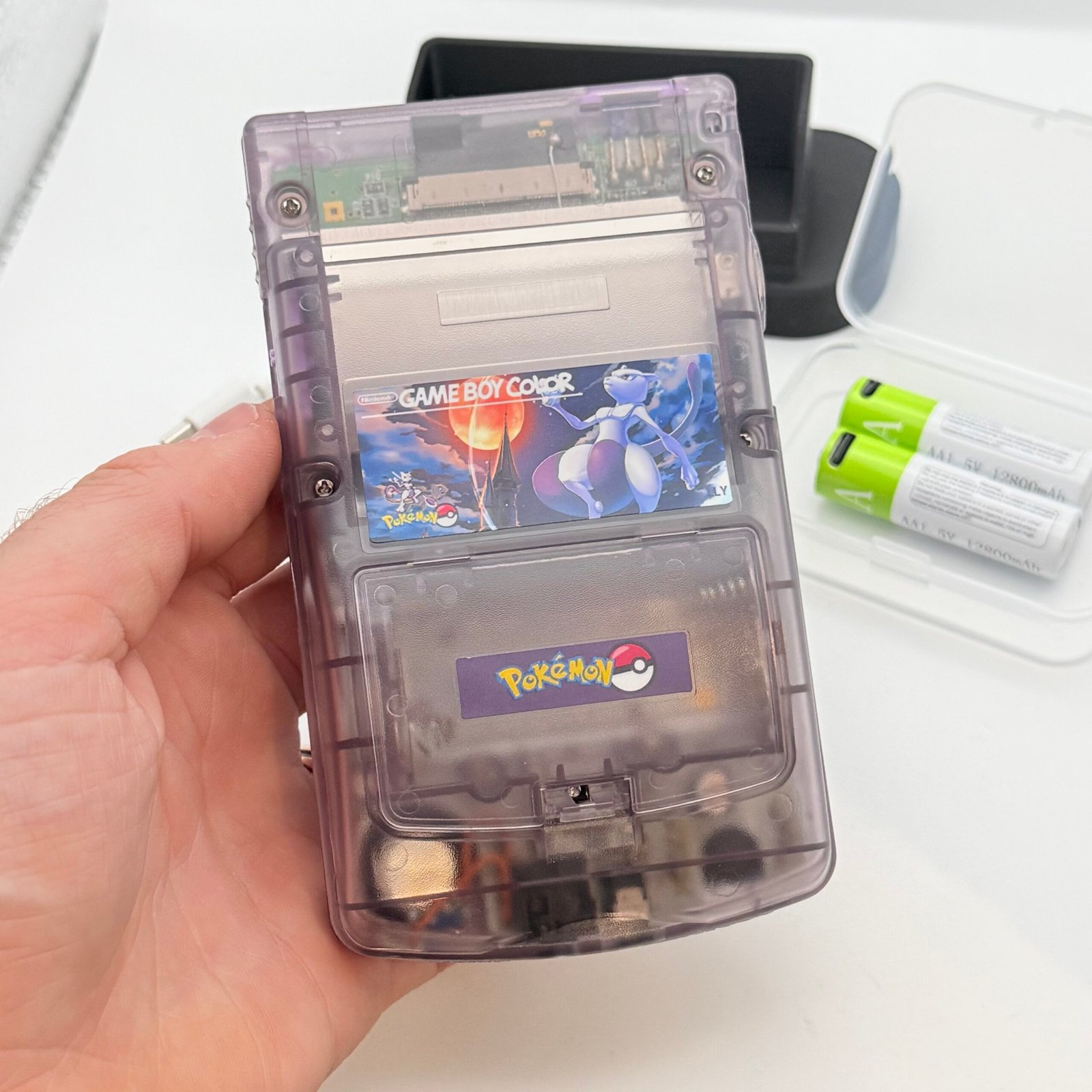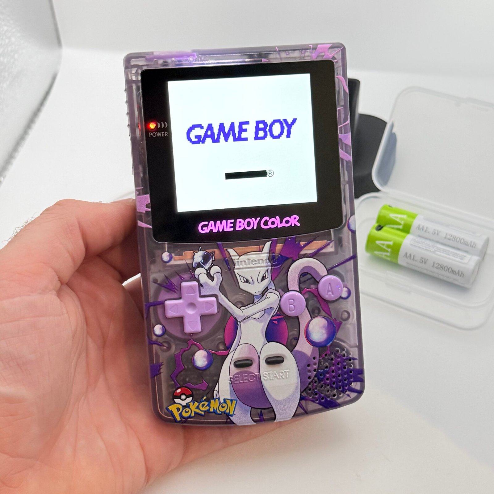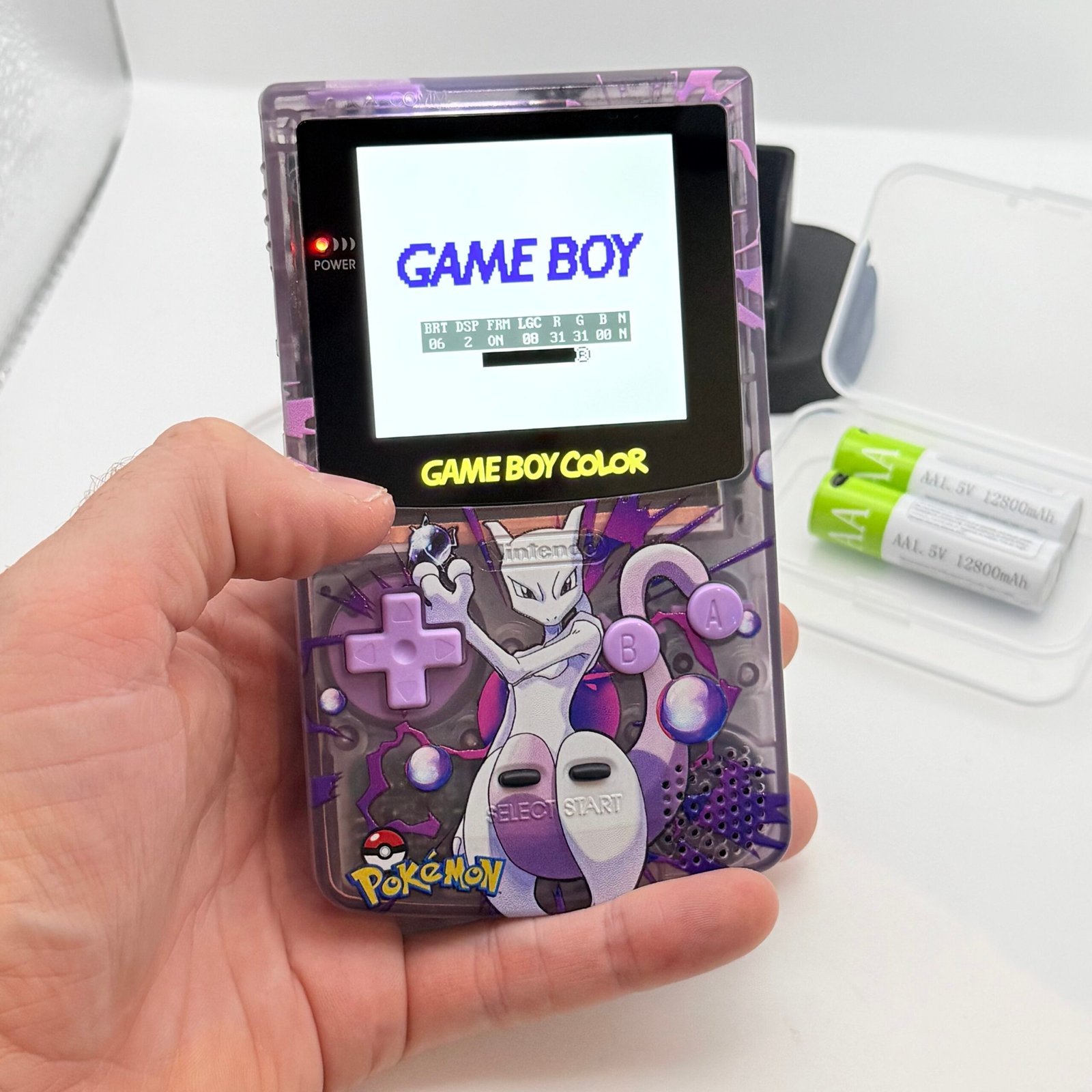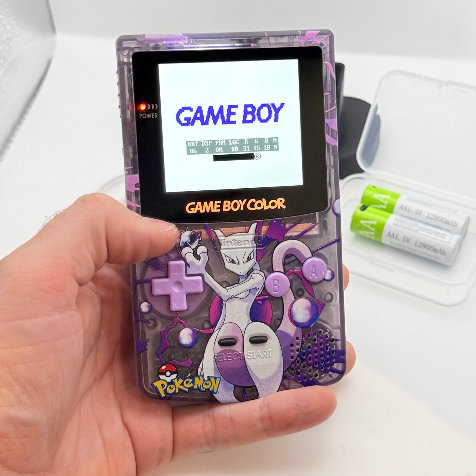 Game Boy Color – IPS V3 – Pokémon Mewtwo+ Stand + 2 Batterie USB-c 12800mAh